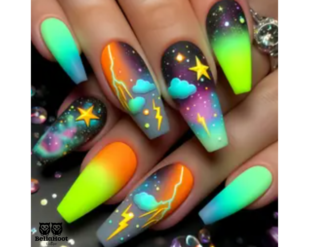 ELECTRIC TONES COLLIDE IN A SKY OF WILD COLORS - STREAK OF LGHTING SOFT CLOUDS AND STAR. LIKE A LATE NIGHT DRIVE THROUGH A NEON STORM.