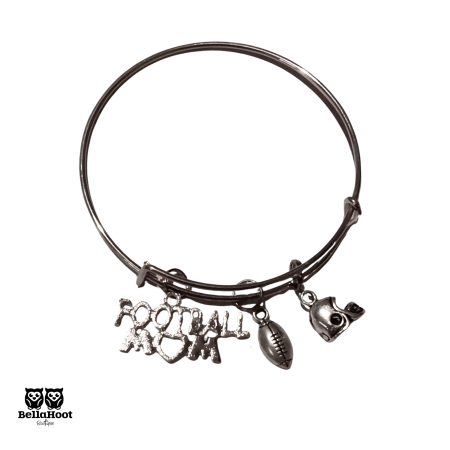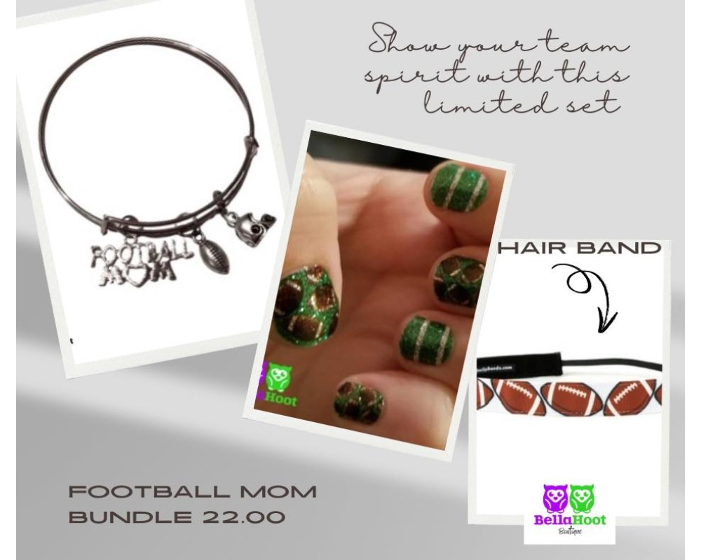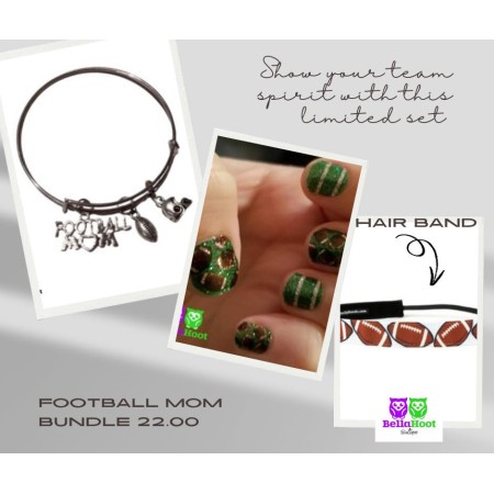 THIS BUNDLE INCLUDES: 1 FOOTBALL HAIR BAND, 1 FOOTBALL SPARKLE POLISH STRIP, 1 FOOTBALL MOM CHARM BRACELET.