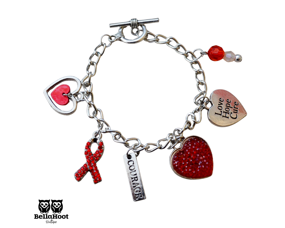 These beautiful charm bracelets are a lovely way to support the heart disease awareness cause! Wear yours every day to remind yourself to keep your heart healthy. Each 7 1/2" silvertone metal bracelet features a toggle clasp and six 1" charms.