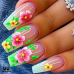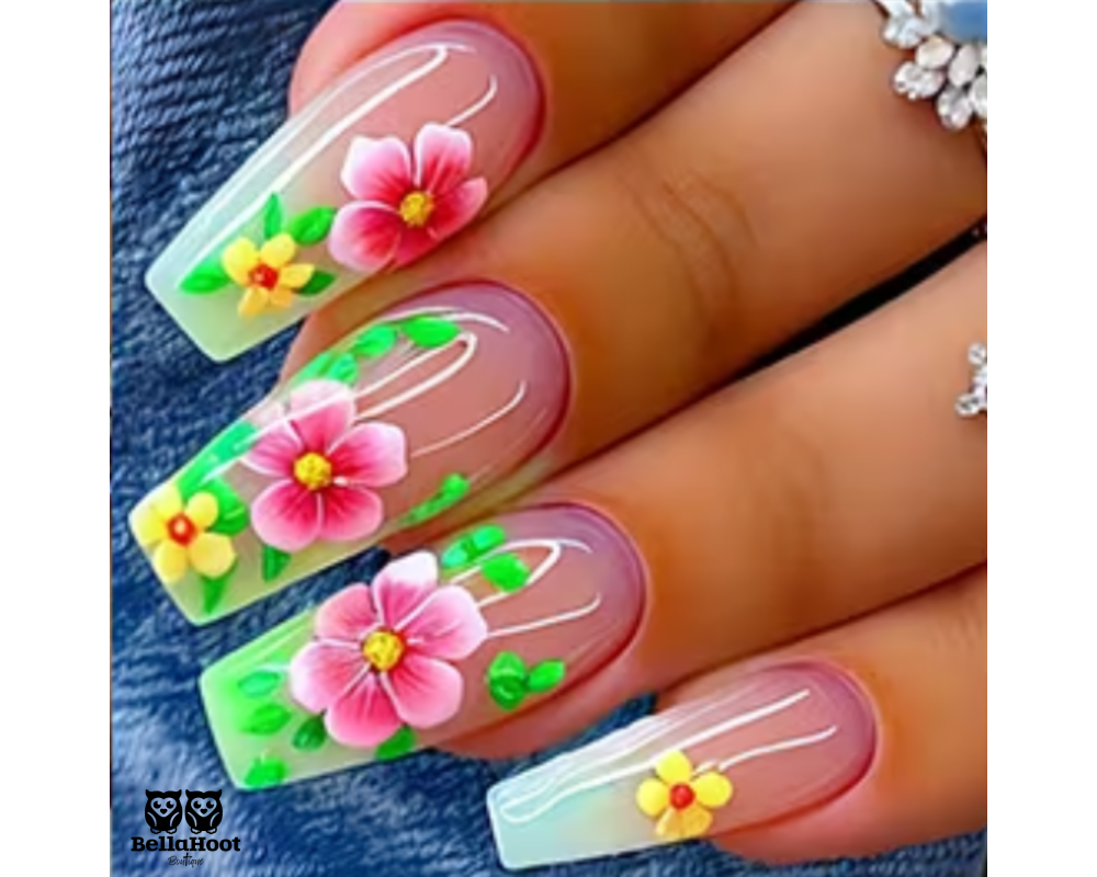Add a fresh pop of color to your day with this vibrant floral press-on nail set. Featuring hand-painted blooms in soft pinks and sunny yellows over a glossy nude base, this design brings a playful yet polished spring feel.