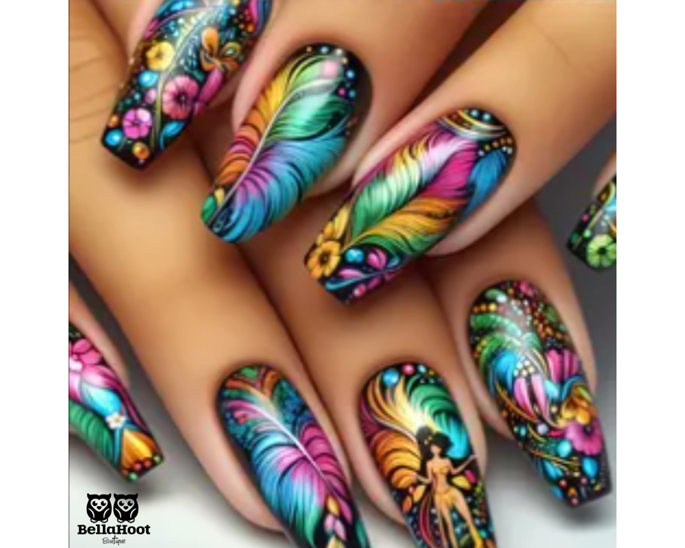 COLORFUL FLORALS SWIRL WITH DELICATE FEATHERS FRAMING THE FREE SPIRITED WOMAN. SHE IS THE JOY OF MOTION ART IN BLOOM - CAPTURING THE WILD BAREFOOT HEARTBEAT OF THE EARTH.