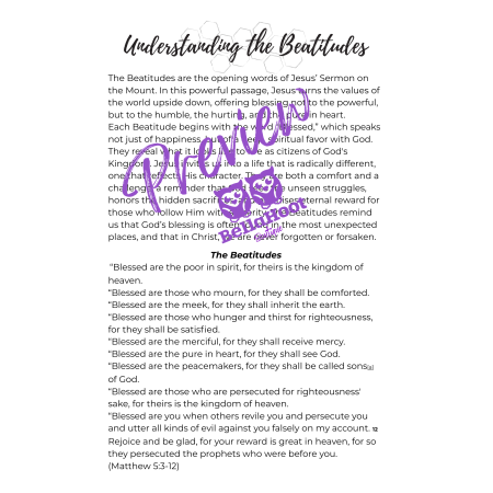 Are you craving spiritual clarity, deeper reflection, and creative connection with God?The Beatitudes 31-Day Creative Journal is more than a journal — it’s a guided 31day planner through the powerful teachings of Jesus in Matthew 5:1–12. Each day invites you to slow down, reflect, and respond creatively to the heart of God.
