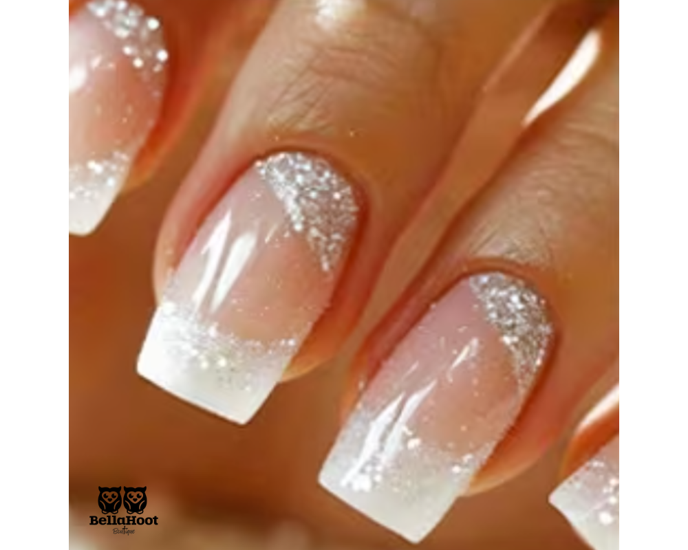A classic white French tip elevated with refined silver sparkle.