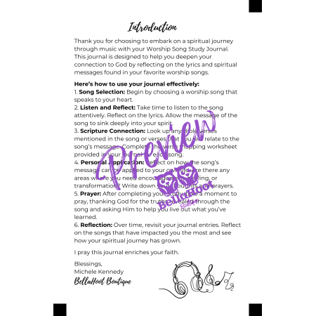 Do you long for a deeper connection with God through worship? The *Worship Song Study Journal* is designed to help you reflect on the lyrics of your favorite worship songs, uncover their biblical foundations, and apply their messages to your daily walk with Christ.