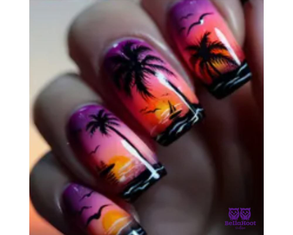 Catch the colors of paradise with palm and tide collection. ombres skies ocean silhouettes and island inspred charm at your fingertips. whether your chasing dreamy sunsets or carefree beach days these nails bring coastal beauty to every moment.