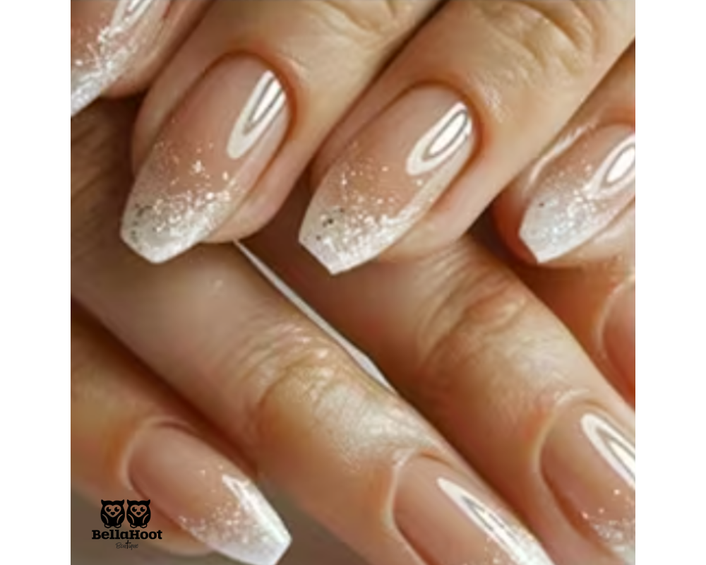 soft bridal white French tip kissed with a luminous shimmer that fades gently toward the cuticle.